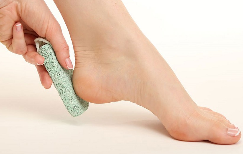 ابتدا یک ظرف مناسب (یا وان) را از آب گرم یا ولرم پر کنید. سپس پاهای خود را در آن قرار داده و بگذارید حداقل ۱۰ دقیقه به همان حالت باقی بماند. اکنون پوست کف پای شما نرم شده و کاملا خیس خورده است. با استفاده از سنگ پا، برس کف پا و یک اسکراب مناسب مانند لیف، پوست کف پای خود را لایه‌برداری کنید.